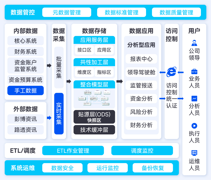 為了深挖數(shù)據(jù)價值、有效反哺業(yè)務(wù),建立企業(yè)級大數(shù)據(jù)平臺,用以全面采集數(shù)據(jù)、標準化數(shù)據(jù)模型、統(tǒng)一指標體系、拓展數(shù)據(jù)應(yīng)用場景,成為財務(wù)公司數(shù)字化轉(zhuǎn)型的必然選擇。