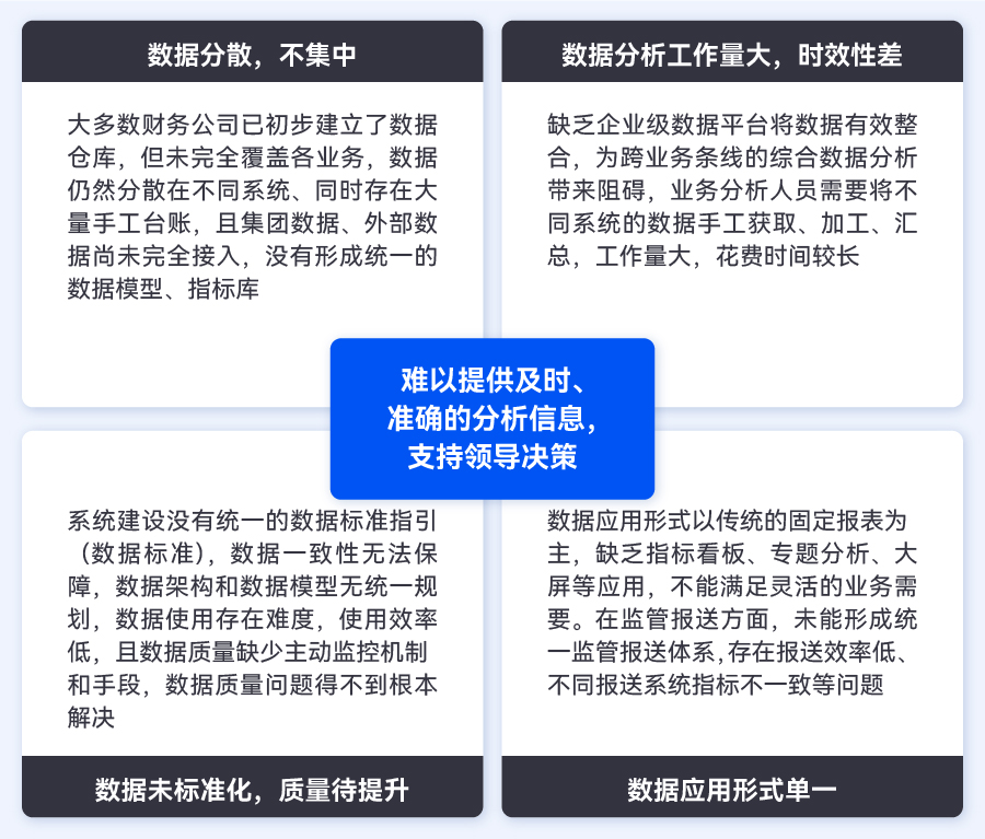2022年2月國務(wù)院國資委發(fā)布了《關(guān)于中央企業(yè)加快建設(shè)世界一流財務(wù)管理體系的指導(dǎo)意見》,《意見》高度重視“完善智能前瞻的財務(wù)數(shù)智體系”,要求各企業(yè)統(tǒng)一數(shù)據(jù)規(guī)范,避免數(shù)據(jù)孤島、維護數(shù)據(jù)資產(chǎn)、激活數(shù)據(jù)價值?!皵?shù)據(jù)”已成為財務(wù)數(shù)字化轉(zhuǎn)型的核心資產(chǎn)要素,但相較于商業(yè)銀行,財務(wù)公司受制于起步晚、業(yè)務(wù)性質(zhì)不同等因素,大數(shù)據(jù)能力建設(shè)客觀上仍然存在不小的差距,主要體現(xiàn)在以下方面:
