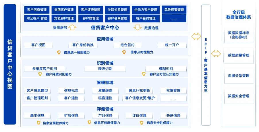 長亮科技統(tǒng)一客戶管理中心的整體設(shè)計,是基于全行的客戶數(shù)據(jù)管理與數(shù)據(jù)治理體系,以存儲領(lǐng)域、管理領(lǐng)域、識別領(lǐng)域、應(yīng)用領(lǐng)域的數(shù)據(jù)為資源,進行數(shù)據(jù)資產(chǎn)服務(wù)化,以業(yè)務(wù)為中心的數(shù)據(jù)化運營。
