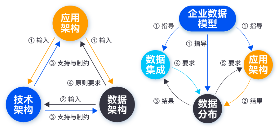 應用架構(gòu)是數(shù)據(jù)架構(gòu)的輸入。數(shù)據(jù)的分布是數(shù)據(jù)在業(yè)務應用與數(shù)據(jù)應用系統(tǒng)中的分布,這些系統(tǒng)的業(yè)務功能決定了將產(chǎn)生哪些數(shù)據(jù)以及需要哪些數(shù)據(jù),因此,應用架構(gòu)設計決定了數(shù)據(jù)的分布,指導數(shù)據(jù)架構(gòu)中數(shù)據(jù)定義、數(shù)據(jù)集成與交互等規(guī)劃和管控工作。數(shù)據(jù)架構(gòu)設計對應用架構(gòu)的輸入不應照單全收,應用系統(tǒng)中的數(shù)據(jù)模型設計應遵循企業(yè)數(shù)據(jù)架構(gòu),數(shù)據(jù)分布與集成的原則要求影響應用系統(tǒng)的功能分布。
