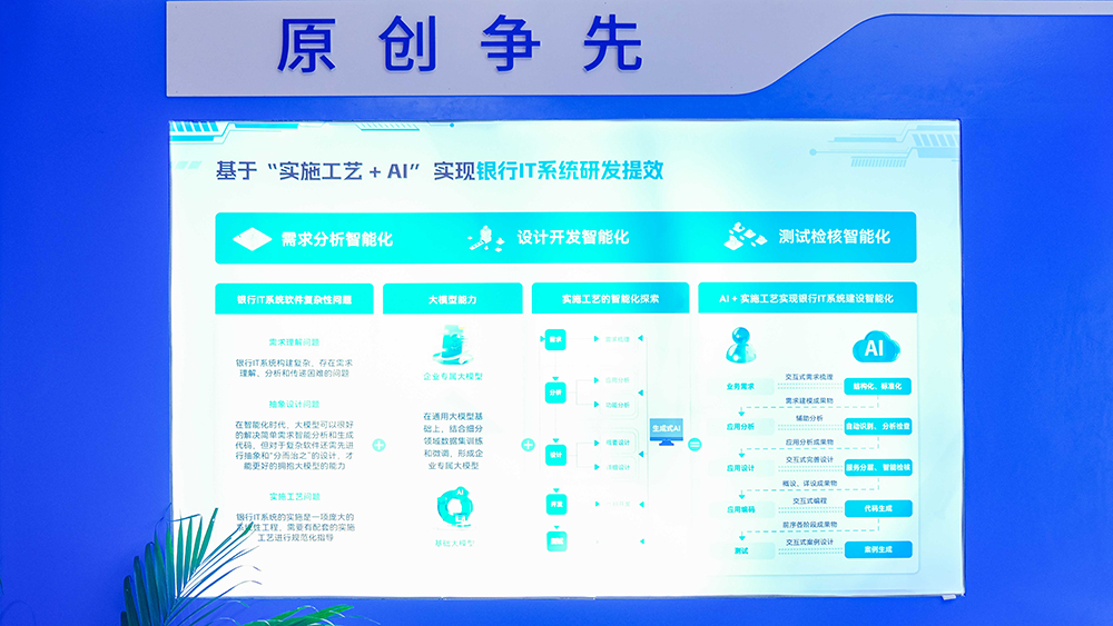 隨著人工智能時代的來臨,長亮科技認為未來軟件工程將向著智能化編程、AI大模型的方向進化,并創(chuàng)新探索出 “實施工藝+AI”這一前沿成果。通過將傳統(tǒng)業(yè)務需求轉化為結構化的數字需求資產,實現(xiàn)了從傳統(tǒng)代碼驅動到數字資產驅動的轉變,同時利用生成式AI技術在各個研發(fā)階段提供智能輔助,助力銀行重塑研發(fā)高效新模式,實現(xiàn)智能化的系統(tǒng)建設。