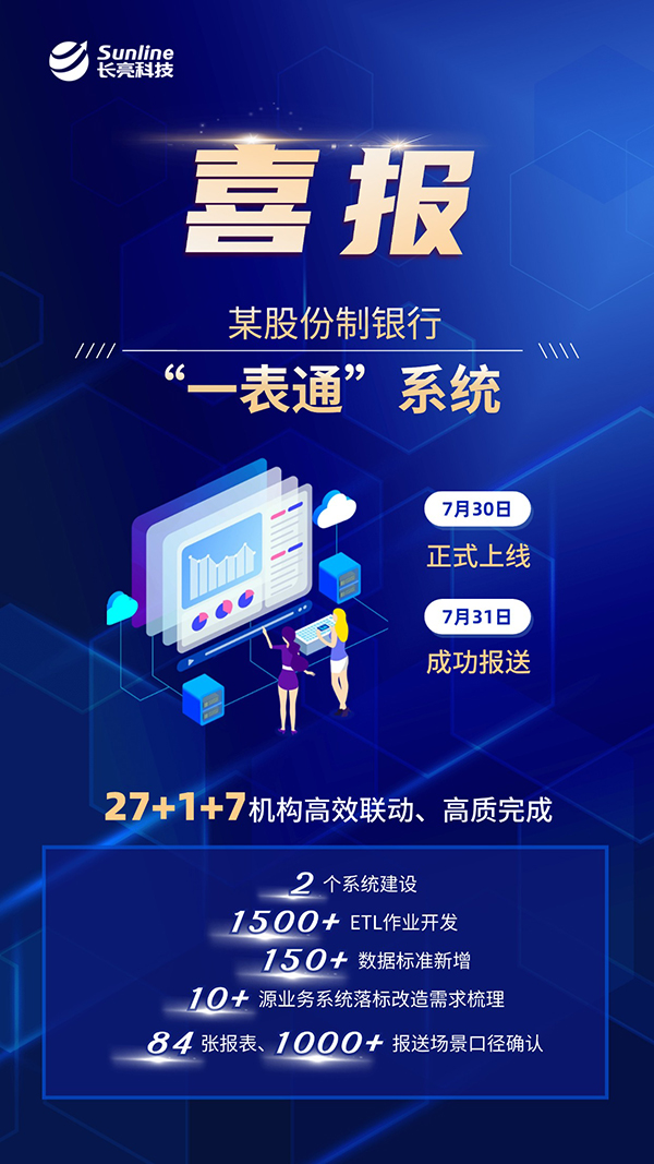 7月31日,某股份制銀行與長亮科技共建的“一表通”系統(tǒng)正式上線,并順利完成2.0版月報數(shù)據(jù)(6月)和2.0版日報數(shù)據(jù)(7月23日-27日)的報送工作。