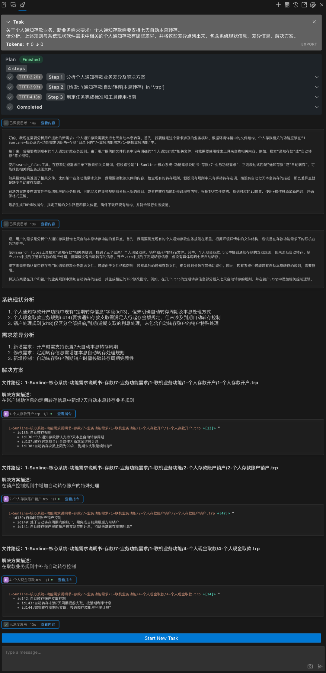 b. 深度推理:通過檢索需求文檔,分析系統(tǒng)現(xiàn)狀分析,識別需求差異,并給出解決方案建議