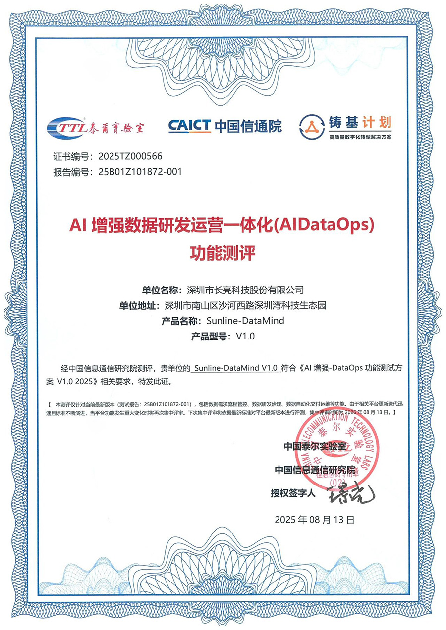 近日,長(zhǎng)亮科技自主研發(fā)的數(shù)智一體化平臺(tái)DataMind,順利通過中國(guó)信息通信研究院(以下簡(jiǎn)稱“信通院”)與中國(guó)泰爾實(shí)驗(yàn)室聯(lián)合開展的 AI 增強(qiáng)數(shù)據(jù)研發(fā)運(yùn)營(yíng)一體化(AIDataOps)功能測(cè)評(píng),標(biāo)志著 DataMind 在數(shù)據(jù)全鏈路管理的智能化、標(biāo)準(zhǔn)化能力上得到國(guó)家級(jí)權(quán)威機(jī)構(gòu)的高度認(rèn)可,為金融行業(yè)數(shù)據(jù)價(jià)值釋放樹立了標(biāo)桿范式。