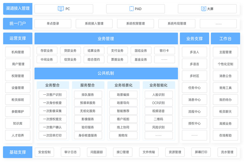 定位于面向場景設(shè)計(jì)的、能夠支撐銀行網(wǎng)點(diǎn)一體化信息建設(shè)的新型應(yīng)用平臺(tái),設(shè)計(jì)上以客戶為中心,以智能化、高效運(yùn)營、業(yè)務(wù)統(tǒng)一化為目標(biāo),同時(shí)整合網(wǎng)點(diǎn)內(nèi)外所有人、設(shè)備和系統(tǒng),將業(yè)務(wù)流程打通,面向客戶進(jìn)行數(shù)據(jù)共享,做到一次識(shí)別、一次驗(yàn)證、一次確認(rèn)、一次打印,助力銀行提高客戶體驗(yàn)度、提升柜員作業(yè)效率、降低網(wǎng)點(diǎn)操作風(fēng)險(xiǎn),全面提升網(wǎng)點(diǎn)的營銷能力和服務(wù)能力。