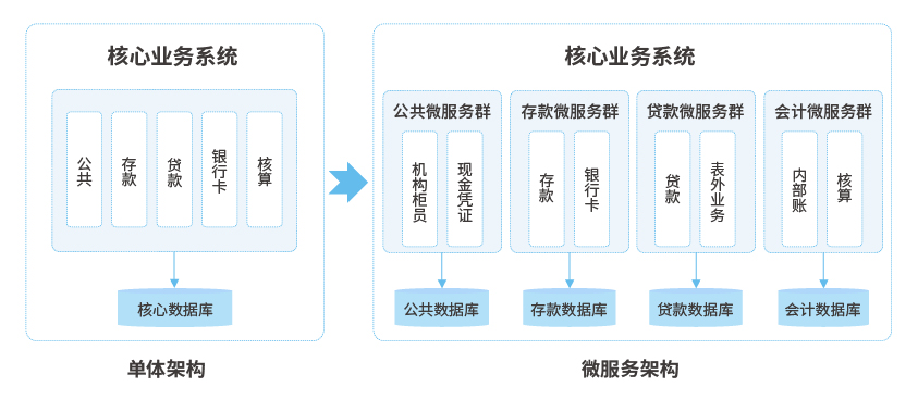 一、微服務架構,按業(yè)務模塊進行服務拆分,比如:存款、貸款等;