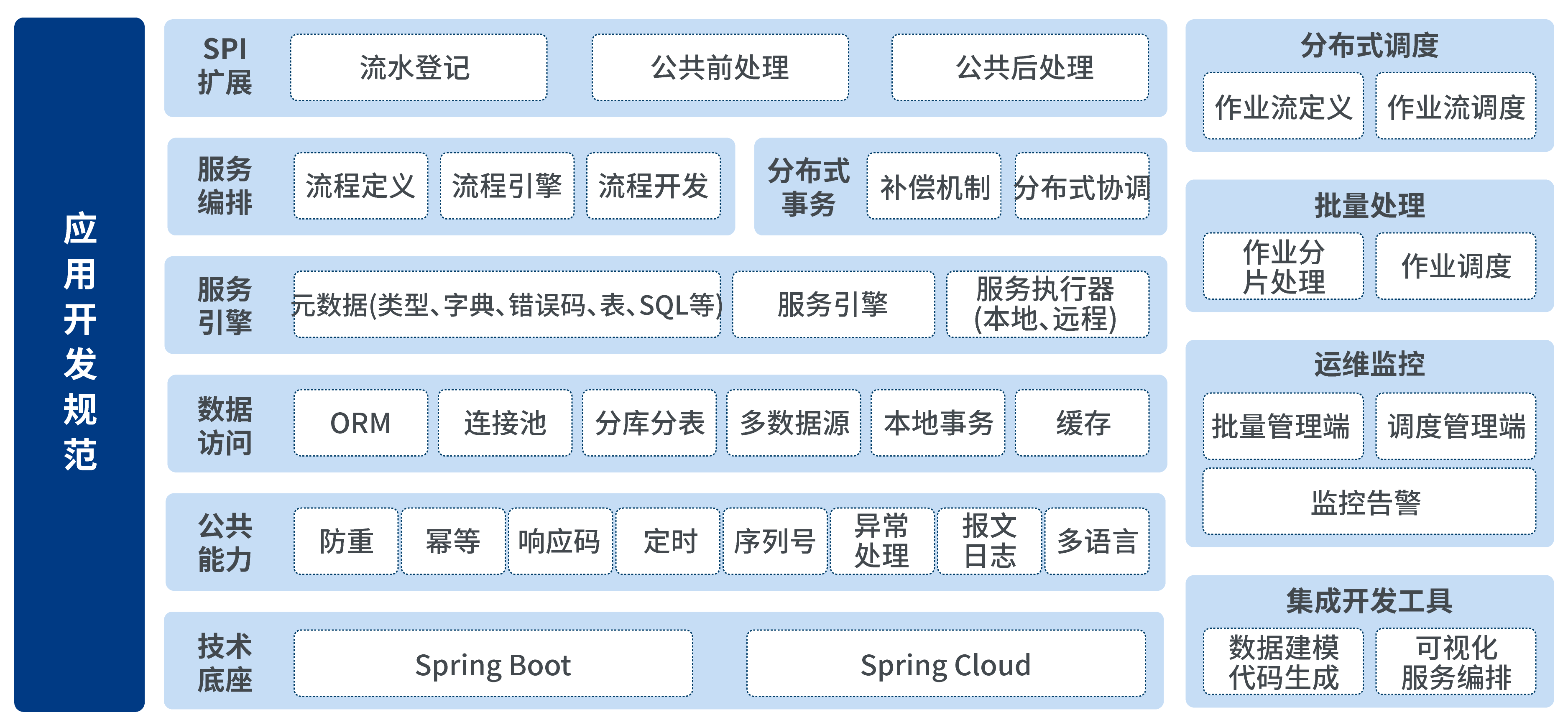 新一代金融應用平臺總體架構由聯(lián)機引擎(服務引擎、服務編排、分布式事務、元數(shù)據(jù)等)、批量引擎(分布式調(diào)度、批量處理)、公共能力(防重、冪等、序列號、數(shù)據(jù)訪問、SPI機制、技術底座等)、開發(fā)工具和開發(fā)規(guī)范組成。