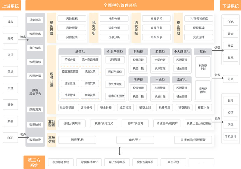對金融機(jī)構(gòu)的增值稅及其附加稅、印花稅、房產(chǎn)稅、土地使用稅、車船稅、個人所得稅、企業(yè)所得稅等全部稅種進(jìn)行涉稅事務(wù)管理,采集各稅種對應(yīng)的業(yè)務(wù)數(shù)據(jù)形成涉稅檔案并計提相應(yīng)稅費(fèi),自動出具納稅申報報表;集中實(shí)現(xiàn)了增值稅價稅分離、銷項管理、進(jìn)項管理、發(fā)票開具、所得稅匯算清繳等功能,幫助企業(yè)及時分析稅負(fù)和籌劃稅務(wù)。