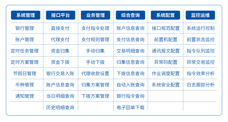 ?業(yè)務(wù)管理模塊:對各業(yè)務(wù)模塊發(fā)起的歸集、支付重發(fā)、接口查詢等操作進行處理;業(yè)務(wù)處理平臺同時支持對資金歸集、對外支付、入賬管理等業(yè)務(wù)功能進行手工和定時操作;