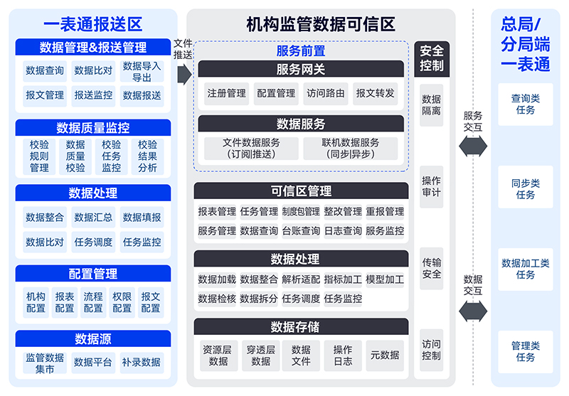 屏蔽底層技術(shù)細(xì)節(jié):通過(guò)服務(wù)前置提供標(biāo)準(zhǔn)的服務(wù)接口,打通監(jiān)管端和機(jī)構(gòu)監(jiān)管可信區(qū),從而屏蔽機(jī)構(gòu)端的底層存儲(chǔ)和技術(shù)差異,實(shí)現(xiàn)服務(wù)交互和數(shù)據(jù)交互。