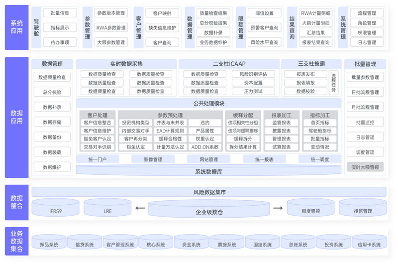 由第一支柱RWA計量系統(tǒng)、第二支柱ICAAP系統(tǒng)、第三支柱披露系統(tǒng)三大部分組成。其中,第一支柱RWA計量系統(tǒng)整合三大風(fēng)險(信用風(fēng)險、市場風(fēng)險、操作風(fēng)險)加權(quán)資產(chǎn),實現(xiàn)風(fēng)險加權(quán)資產(chǎn)和資本充足指標(biāo)的準(zhǔn)確計量,并實現(xiàn)資本充足率等監(jiān)管指標(biāo)的自動計算和管理;第二支柱ICAAP系統(tǒng),構(gòu)建完備的內(nèi)部資本充足評估體系,將風(fēng)險管理和資本管理緊密結(jié)合,滿足監(jiān)管合規(guī);第三支柱披露系統(tǒng),構(gòu)建完整的第三支柱披露報表管理體系,實現(xiàn)披露報表的準(zhǔn)確、合理、合規(guī)、追溯及審計要求。