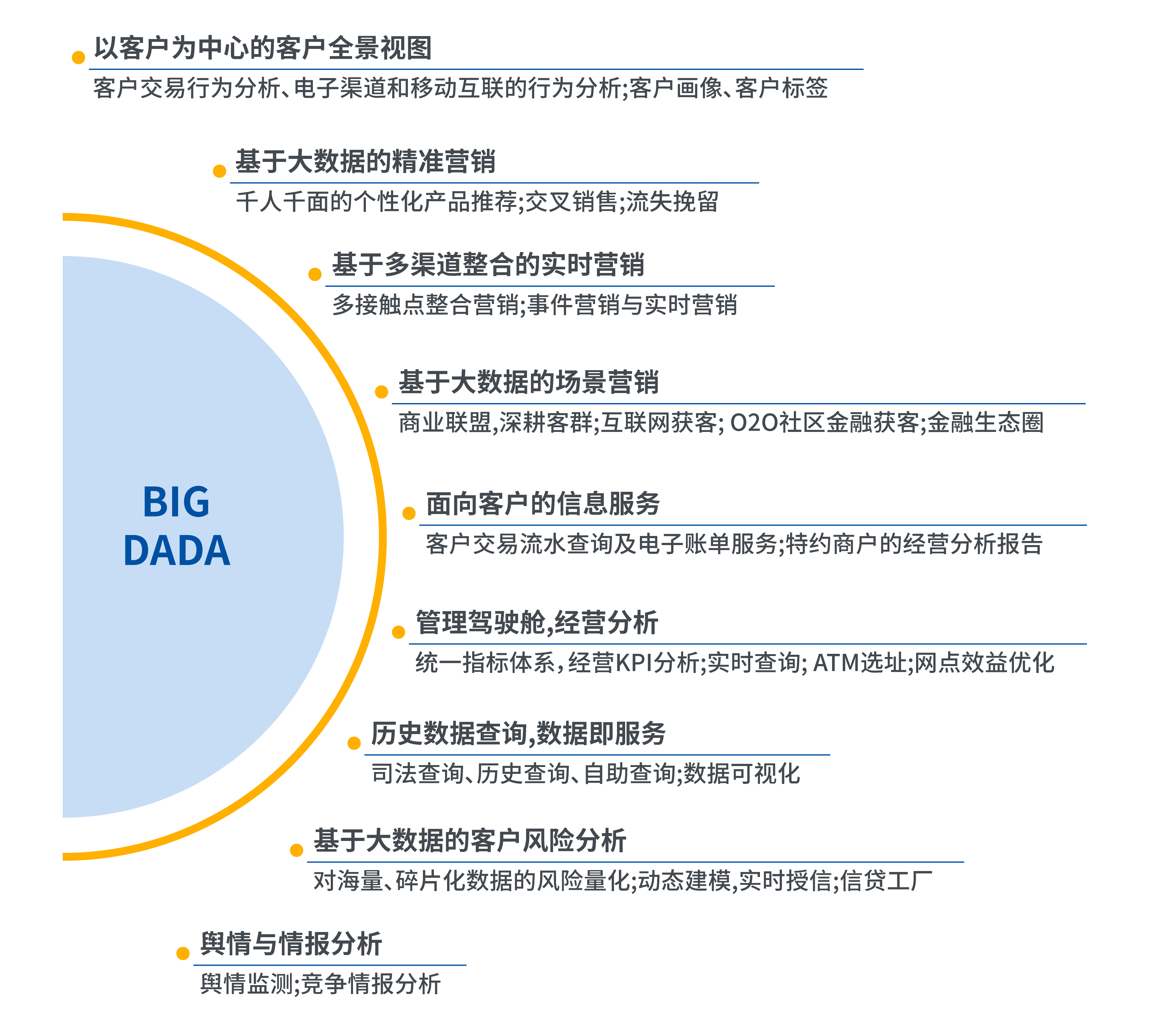 運(yùn)營(yíng)管理丨通過大數(shù)據(jù)分析平臺(tái),強(qiáng)化數(shù)據(jù)在業(yè)務(wù)協(xié)同中的價(jià)值,在市場(chǎng)營(yíng)銷、產(chǎn)品研發(fā)等環(huán)節(jié)真正實(shí)現(xiàn)以數(shù)據(jù)為驅(qū)動(dòng),加強(qiáng)總行統(tǒng)籌主導(dǎo)的集約化管理體系,全方面提升運(yùn)營(yíng)管理效率。還可以支持網(wǎng)點(diǎn)效益提升、ATM選址優(yōu)化等。